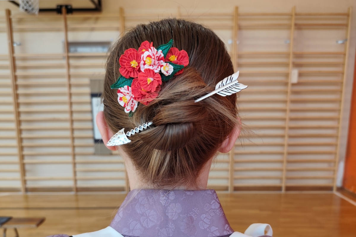 Żeby trochę rozruszać publiczność następnym punktem programu była wspólna nauka hassetsu (8-mio etapowy proces napięcia łuku i wypuszczenia strzały). Uczestnicy najpierw pilnie obserwowali i powtarzali, a następnie zaprezentowali piękną formę. Widać było pełne skupienie i staranność ruchów, za co przyznaliśmy nagrody. Wyłonione zostały 3 osoby, które najlepiej poradziły sobie z tym zadaniem.